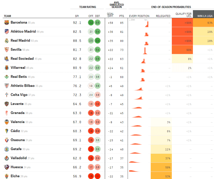 来源:24直播网04-07 19:3224直播网讯 西甲29轮过后,马竞在西甲积分榜上的领先优势已经变成了1分,这是所有人都没有想到的,此前马竞可以说是西甲夺冠最大的热门球队,他们曾经一度领先皇马、巴萨12分之多,但是现在马竞已经下滑了,他们虽然有积分优势,但是各大媒体已经不看好马竞夺冠了。近日,著名数据网站“538”更新了本赛季西甲夺冠几率,其中巴萨排名第一,而马竞仅排名第二,皇马位居第三。