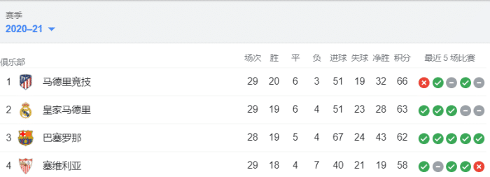 马竞目前29轮积66分排名第一,而皇马则29轮积63分排名第二,巴萨第29轮还未进行,积62分排名第三。