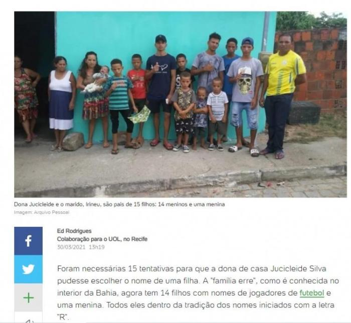 来源:24直播网03-31 17:0824直播网讯3月31日 据巴西媒体UOL报道,有一对来自巴西巴伊亚州的夫妇,因为热爱足球,生了15个孩子组足球队,名字均以“R”字母开头。