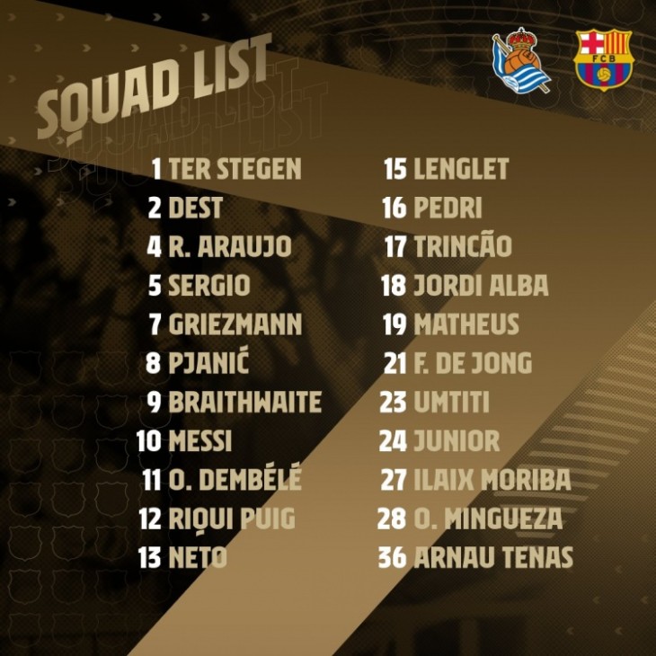 24直播网讯北京时间3月20日讯 巴萨公布联赛客场对阵皇家社会的大名单,梅西、格列兹曼在列,皮克伤缺,莫里巴、阿劳霍入选。