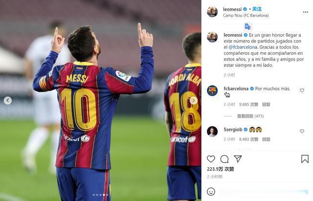 赛后,这位阿根廷巨星在Instagram上写道:“能在巴萨踢这么多场比赛是一种巨大的荣耀,感谢这些年来陪伴我的同事、家人和朋友们。”