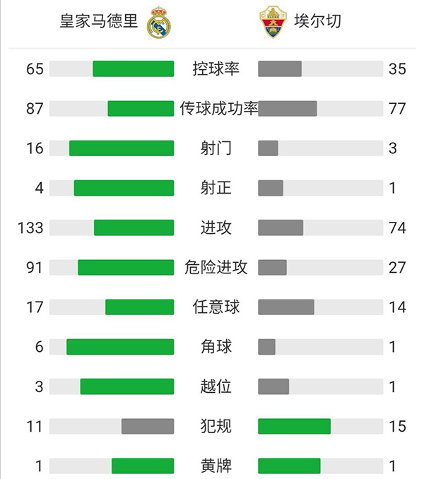 全场比赛结束,皇家马德里主场2-1逆转埃尔切。
