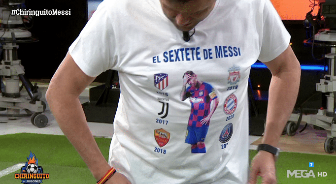梅西踢丢了点球,这也让不少讨厌梅西的球迷们觉得高兴,这其中一名外国的梅西黑粉还专门制作了一件特殊的T恤,T恤最中间是黯然神伤的梅西,然后围绕在他身边的是马竞、尤文、罗马、利物浦、拜仁和大巴黎的队徽,寓意是最近六个赛季以来,梅西所在的巴萨在欧冠赛场上被这6支球队淘汰出局。