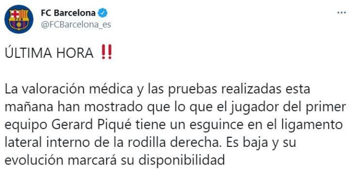 在今天早上的医疗评估中显示,一线队球员杰拉德-皮克右膝内侧韧带扭伤,何时能够回归赛场取决于他的恢复情况。