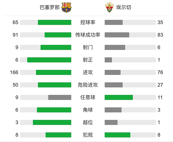 全场比赛结束,巴萨在主场3-0完胜埃尔切。