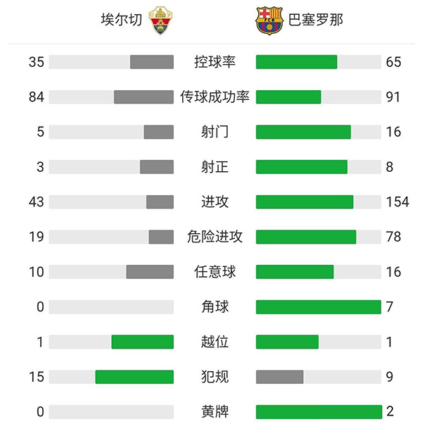 全场比赛结束,巴塞罗那客场2-0战胜埃尔切。