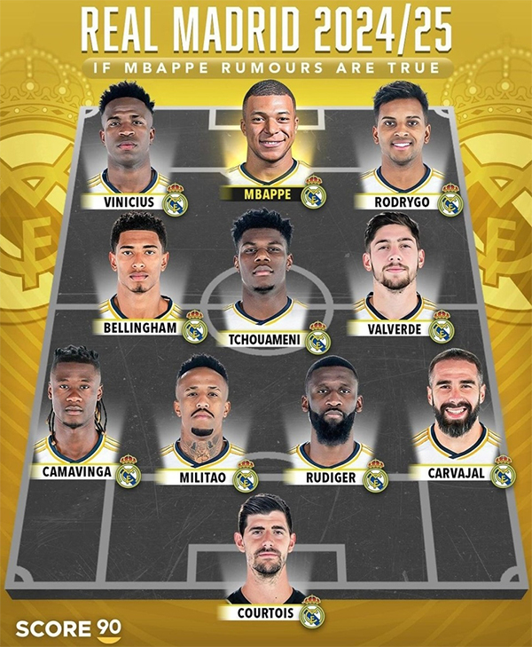 在这套皇马新赛季潜在4-3-3首发阵容中,门将是比利时门神库尔图瓦,他在本赛季复出后保持零封,包括欧冠决赛高接抵挡、屡现神扑。后卫线4人则是卡马文加、米利唐、吕迪格、卡瓦哈尔。中场3人组则是贝林厄姆、琼阿梅尼、巴尔韦德;锋线三叉戟则是威尼修斯、姆巴佩、罗德里戈。