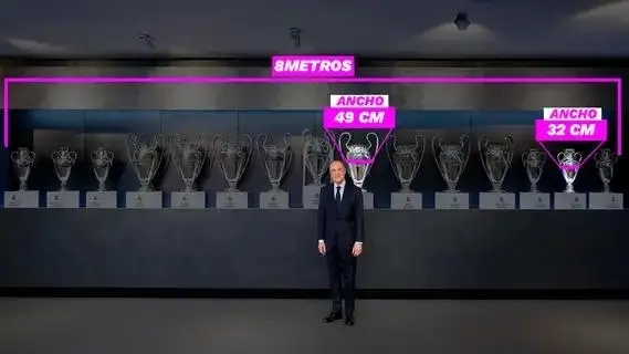 冠军杯宽度较窄为约32厘米,欧冠奖杯为49厘米,15座奖杯紧密排列大约宽度为6.3米,而陈列位置的宽度为约8米,大约还能再放下3座欧冠奖杯。