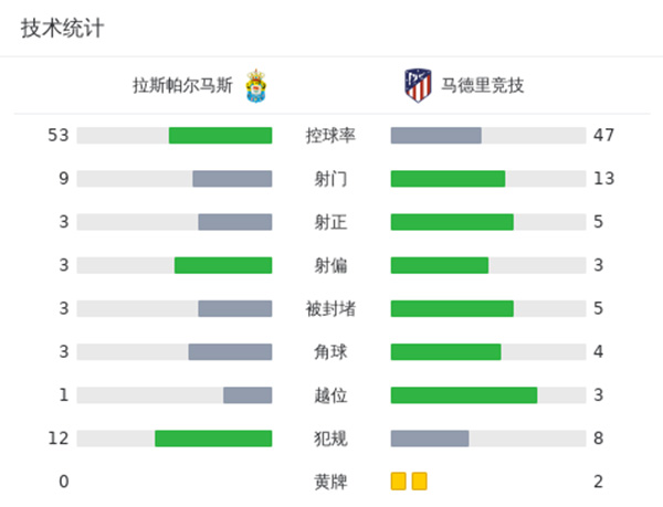 第51分钟,拉斯帕尔马斯打破僵局!格列兹曼后场被断莫莱罗左路弧顶横传中路一漏跟上的罗德里格斯中路一脚低射破门,拉斯帕尔马斯1-0马竞。