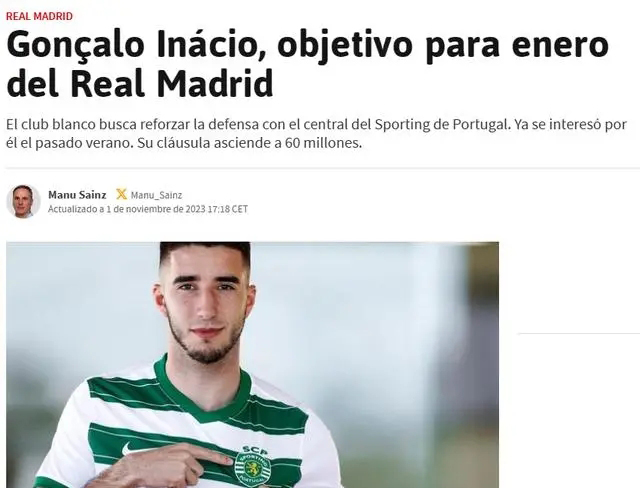 阿斯:皇马考虑一月份引进葡萄牙体育中卫伊纳西奥