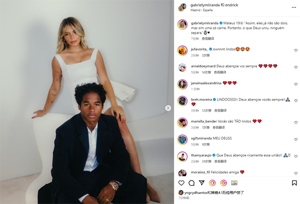 恩德里克手社媒写道:“既然如此,夫妻不再是两个人,乃是一体的了。所以,神撮合的,人不可分开!”,来宣誓他与女友结为夫妻,这位巴西射手还加上了爱心和戒指的表情包,宣布两人的喜事。