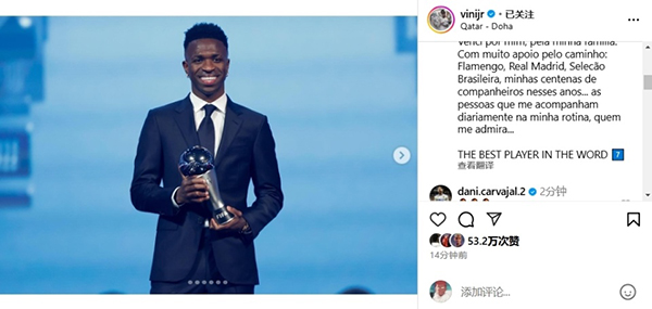 维尼修斯并没有在文中感谢任何人,甚至为他颁奖的国际足联。而有些尴尬的是,他甚至还把英文单词“world”写错成“word”。不过维尼修斯的发文,还是得到了卡瓦哈尔多位皇马队友的点赞和留言支持鼓励。