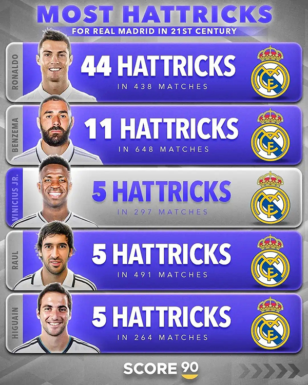 24直播网讯21世纪皇马球员戴帽次数TOP10: