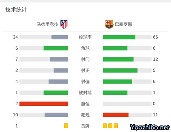 第45分钟,奥布拉克后场大脚开出,利诺左路低平球传中,朱利亚诺-西蒙尼禁区右侧再横传中路,阿尔瓦雷斯包抄推射得手,马竞1-0巴萨!