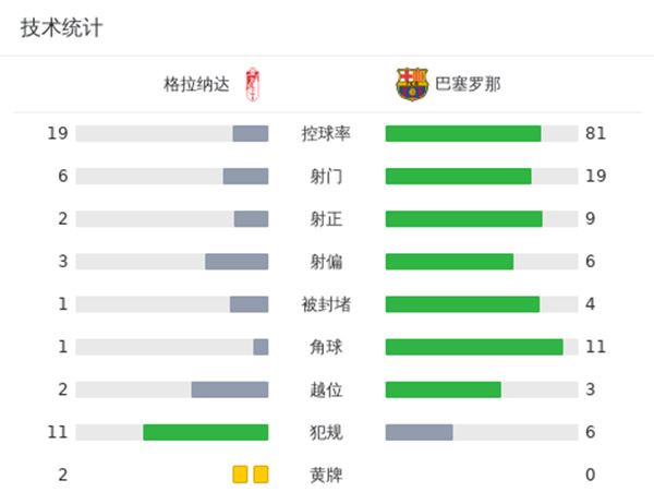 格拉纳达首发:13-安德烈-费雷拉、12-里卡德-桑切斯(85' 5-巴列霍)、4-米格尔-鲁比奥、14-米克尔、15-卡洛斯-涅瓦、26-萨拉戈萨、24-比利亚尔(59' 18-彼得罗维奇)、23-贡巴乌、33-阿尔瓦罗-费尔南德斯(59' 28-劳尔-托伦特)、11-乌祖尼(58' 10-安东尼奥-普埃塔斯)、7-卢卡斯-博耶(74' 9-卡列洪)