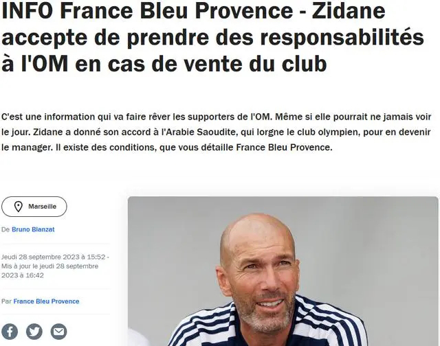 法媒:若俱乐部出售给沙特阿拉伯,齐达内将出任马赛主教练