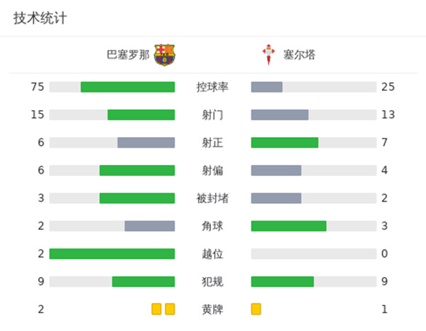 第75分钟,塞尔塔再下一城!阿斯帕斯精准斜塞杜维卡斯单刀机会推射远角破门,巴萨0-2塞尔塔。