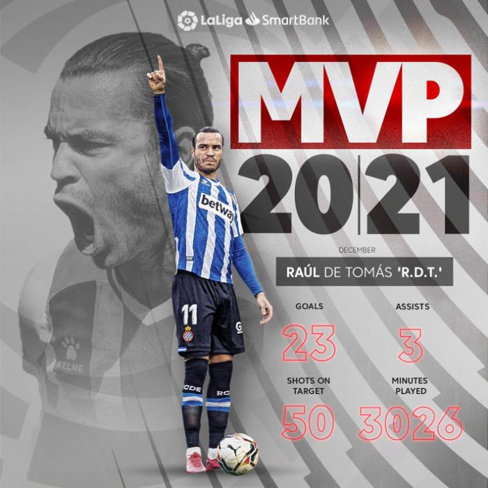 西班牙联赛官方账号在社交媒体上晒出为德托马斯制作的MVP照片,宣布他荣膺本赛季的西乙最佳球员。