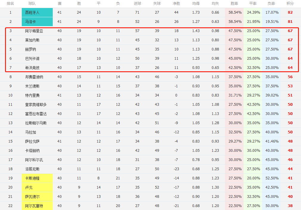 来源:24直播网05-24 18:0624直播网讯 西乙联赛已经诞生了2个直接升甲球队,分别是西班牙人和马略卡,两队拿到了新赛季西甲的参赛资格,剩下的一个名额将由第三四五六名通过附加赛产生。目前5队在竞争附加赛区的4个名额,分别是第三名的阿尔梅里亚(67分)、第四名的莱加内斯(67分)、第五名的赫罗纳(67分)、第六名的巴列卡诺(64分)、第七名的希洪竞技(64分),五队的第41轮比赛还未开打,竞争形势可以说相当混乱,争六悬念巨大。