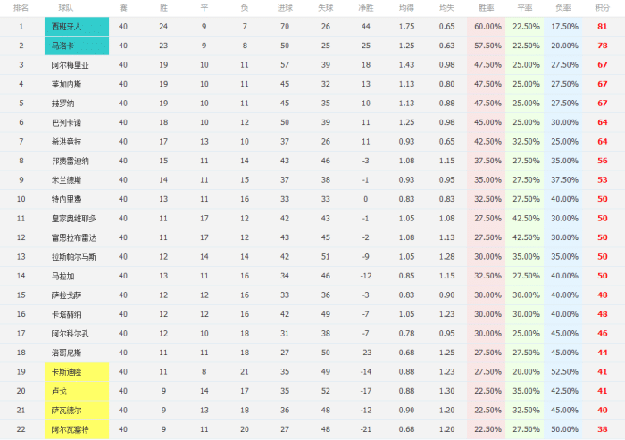 第四名的莱加内斯本轮也不胜,0-0被米兰德斯战平,积分榜同样是67分;第五名的赫罗纳成为了近期的焦点,本轮1-0战胜了马拉加,从而完成疯狂大逆袭,一路从积分榜6名开外逆袭杀入前5名,而且拿到了67分,与第三、四名的球队同分;第六名的巴列卡诺也赢球了4-1大胜皇家奥维耶多,积分榜64分,以净胜球优势力压同分的希洪竞技排名第6名。