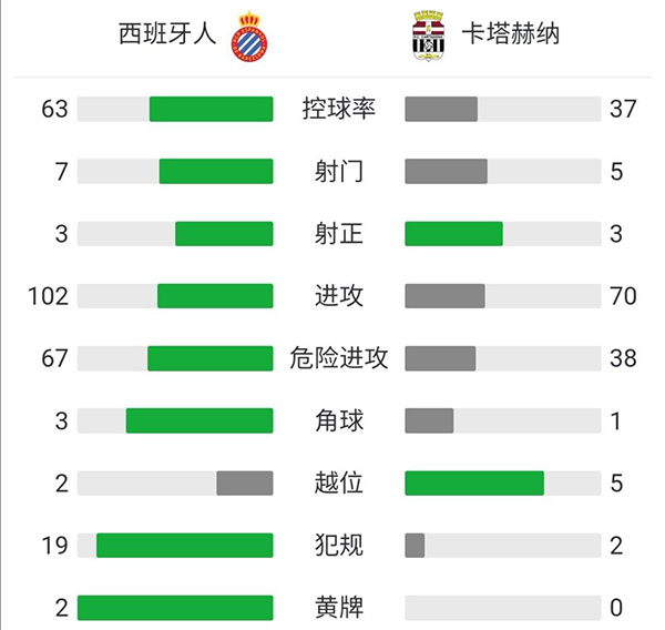 西班牙人首发:1-奥耶尔、27-奥斯卡-希尔、5-卡莱罗、4-卡夫雷拉、3-佩德罗萨、8-梅里达(20`26-波尔-洛萨诺)、10-塞尔希-达德尔、33-梅拉梅德(81`22-马蒂亚斯-巴尔加斯)、23-恩巴尔巴(56`14-梅伦多)、18-迪马塔、7-武磊(56`9-普阿多)