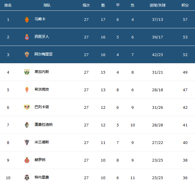 来源:24直播网03-02 15:3924直播网3月2日讯 北京时间3月2日,西乙联赛已经结束了第27轮的争夺,27轮过后,西乙积分榜彻底变天,马略卡逐渐形成了一骑绝尘之势,意外逆袭成为了西乙第一冲甲大热,本轮以1-0战胜洛格罗涅斯之后拿到了57个联赛积分,领先第二名的西班牙人4分;西班牙人53分暂列第二名,本轮爆冷被希洪竞技1-1逼平;第三名的阿尔梅里亚本轮4-1大胜卢戈,拿到了52分,仅仅比西班牙人少1个积分。