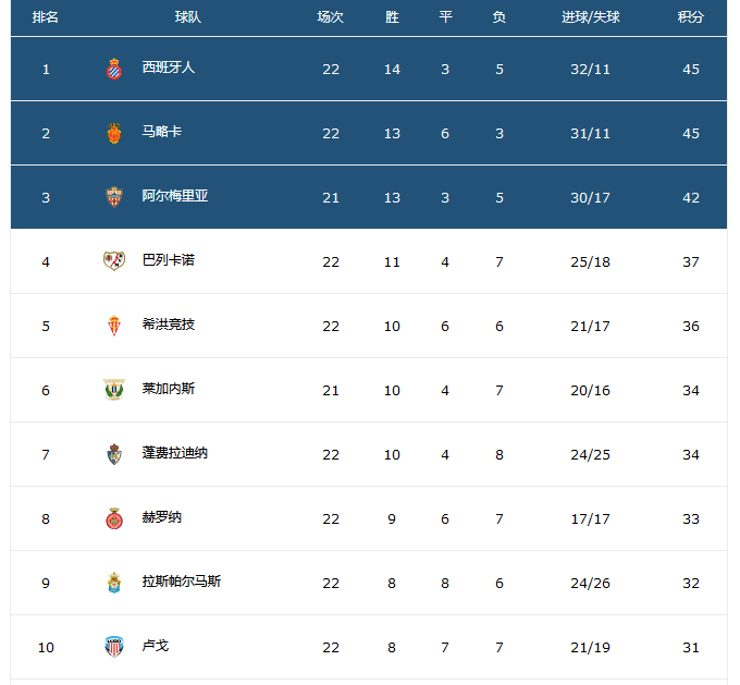 从0-1到0-2!西乙第22轮连爆3大冷,西班牙人+2支冲甲劲敌齐刹车,使得积分竞争形势变得越来越复杂,西班牙人已经没有任何优势可让,阿尔梅里亚虽然本轮爆冷收获一场平局,但是球队势头依然相当迅猛,最近20场只输了2场,是同期战绩最好的球队,比赛西班牙人和马略卡的稳定性都要更好,目前积分13胜3平5负积分42分,由于少赛一轮,阿尔梅里亚补赛获胜的话与马略卡、西班牙人将齐头并进齐冲甲。