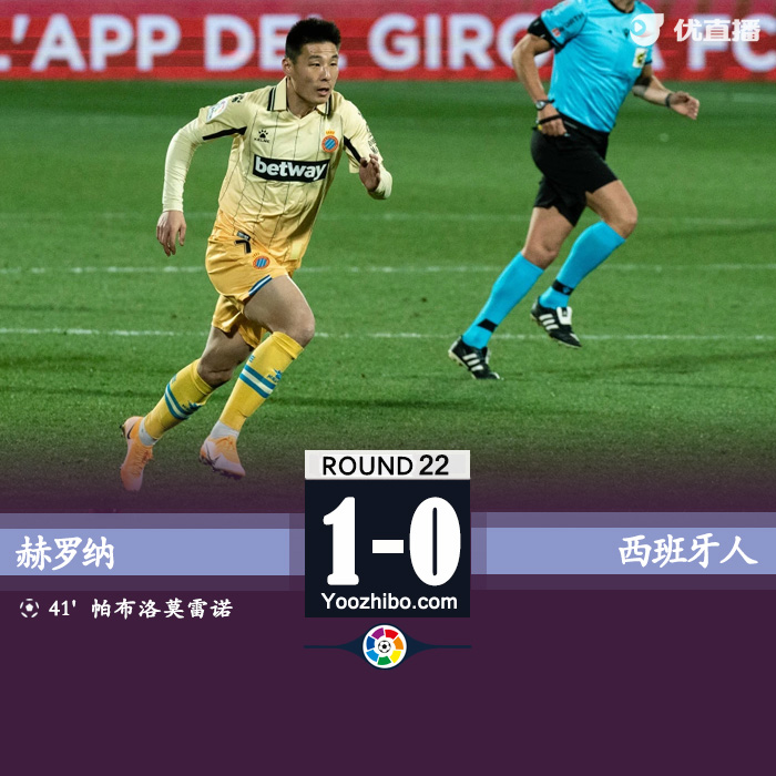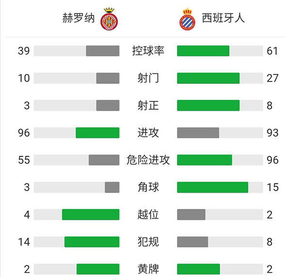 全场比赛结束,西班牙人客场0-1不敌赫罗纳。