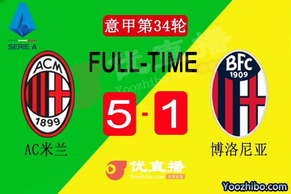 全场比赛结束,AC米兰5-1博洛尼亚。