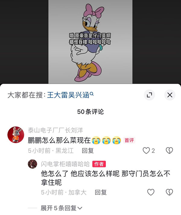 有网友在吴兴涵妻子社媒下面留言:“鹏鹏(吴兴涵)怎么这么菜了现在?”吴兴涵妻子立即反唇相讥道:“他怎么了,他应该怎么样呢,那守门员(王大雷)怎么不拿住呢?,原来我是守门员啊,都怪我咯,哈哈哈哈哈。”显然在吴兴涵妻子看来,泰山次回合的丢球责任并不在吴兴涵,而是王大雷没有做出应有的扑救,导致失球。