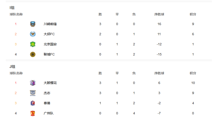 J组:大阪樱花3胜1平以10分领跑,打进了8球只丢2球;第二名的是杰志,3胜1负,拿到9分,打进了5球丢了2球,有望创造历史闯进淘汰赛;第三名的是泰港,1胜1平2负,积分4分,打进4球丢6球;广州队青年军4连败垫底,0分的同时0进球,丢了7球,此次亚冠只踢出了一个亮点,这个亮点是张健智,他在每场比赛都有精彩扑救。