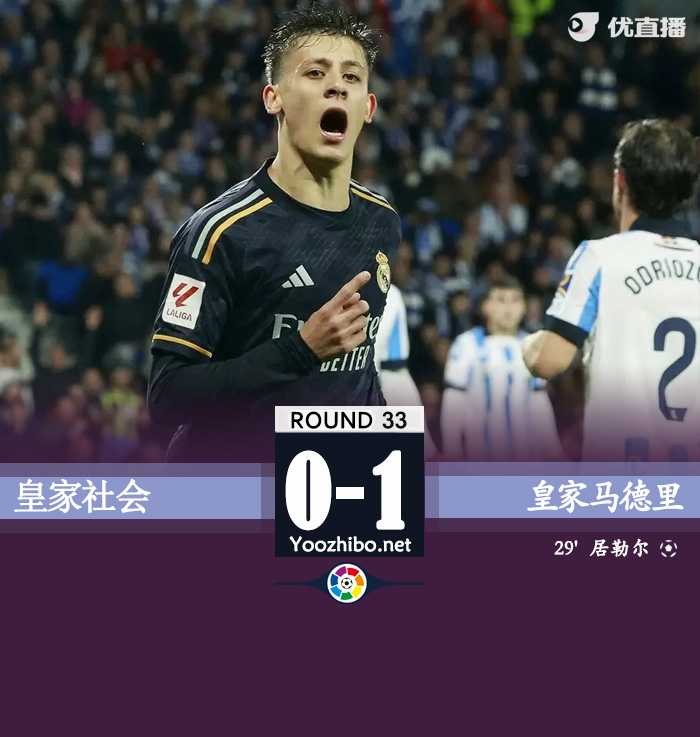 24直播网讯:北京时间4月27日,西甲第33轮,皇马客场挑战皇家社会。上半场,卡瓦哈尔精妙助攻19岁居勒尔打进赛季第二球,久保健英进球被VAR取消。易边再战,奥亚萨瓦尔越位进球被吹。最终皇家社会0-1皇家马德里。积分榜方面,皇马27轮不败先赛14分领跑,皇家社会51分第六。