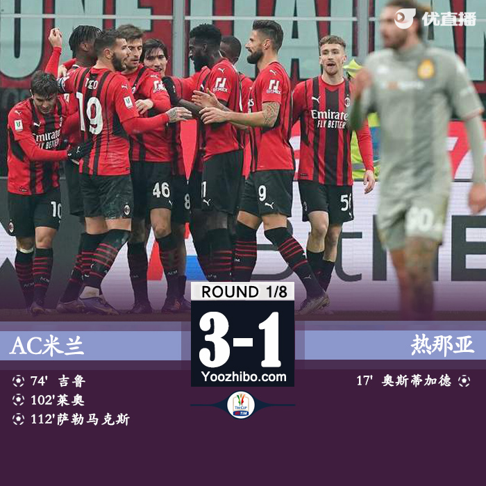 24直播网1月14日讯 北京时间1月14日凌晨4:00,意大利杯1/8决赛,AC米兰迎来热那亚的挑战。上半场波塔诺瓦利用角球机会助攻奥斯蒂加德破门,托莫里伤退,热那亚1-0暂时领先米兰;下半场吉鲁为米兰扳平比分,常规时间两队1-1战平;加时赛莱奥和萨勒马科尔斯建功,最终米兰加时3-1热那亚晋级八强。