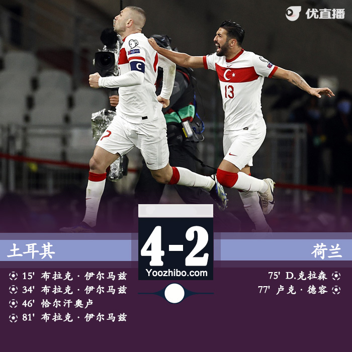 24直播网3月25日讯 北京时间3月25日1点,世预赛欧洲赛区G组荷兰客场对阵土耳其。上半场,伊尔马兹先是远射破门,随后他又打进点球,德里赫特头球中柱。下半场,恰尔汗奥卢轰进世界波,克拉森和卢克德容替补登场后在两分钟内连追两球,伊尔马兹任意球直接破门完成帽子戏法同时为土耳其锁定胜局,补时阶段卡巴克送点,恰基尔将点球扑出,全场比赛结束,土耳其4-2荷兰。
