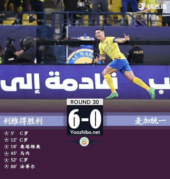 24直播网讯:北京时间5月5日凌晨2时,沙特联第30轮,利雅得胜利主场对阵麦加统一。上半场,C罗八分钟内连入两球上演梅开二度,马内助攻奥塔维奥破门扩大比分优势,尾声阶段,奥塔维奥助攻马内再入一球。半场战罢,利雅得胜利暂4-0麦加统一;下半场,马内助攻C罗再入一球完成帽子戏法,法蒂尔最后时刻补射破门。全场比赛结束,利雅得胜利6-0麦加统一!