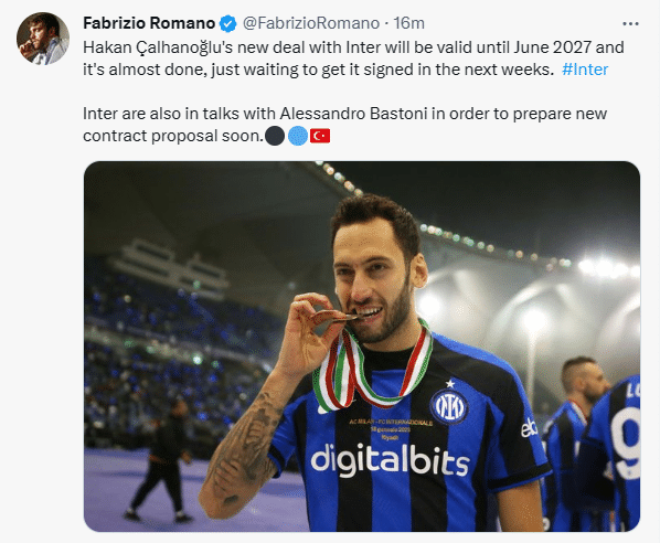 罗马诺表示:恰尔汗奥卢与国际米兰的新合同几乎已经完成,只是等待在未来几周内签署,新合同期限至2027年。