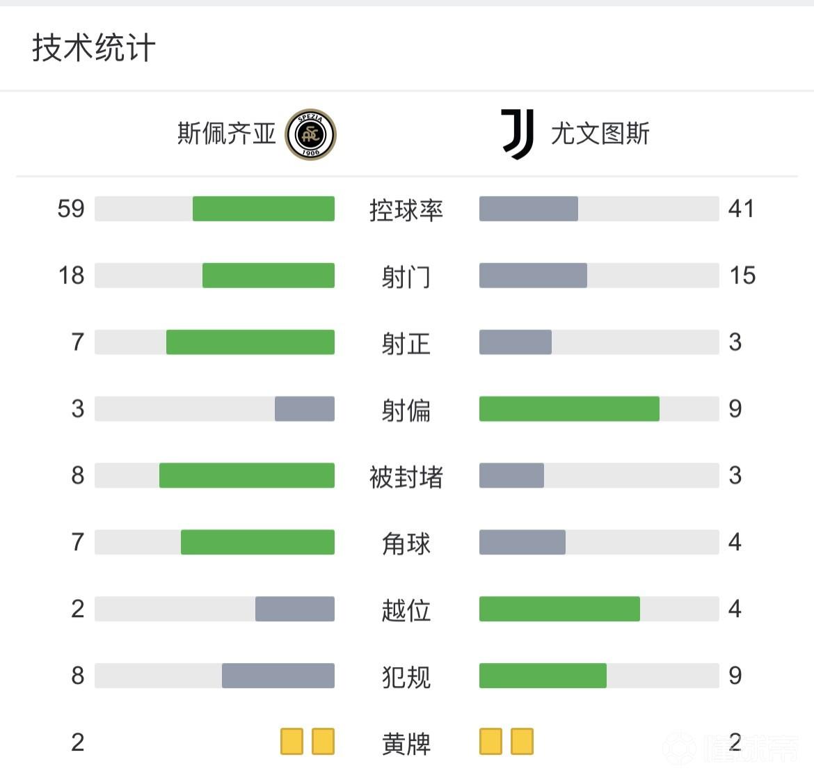 全场比赛结束,最终尤文图斯客场2-0战胜斯佩齐亚。