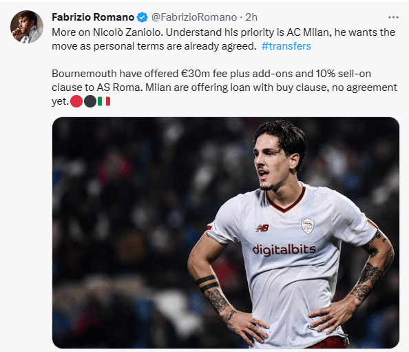 罗马诺:扎尼奥洛已与AC米兰达成个人协议