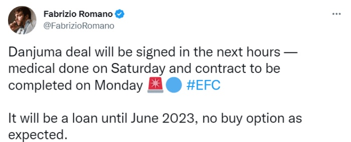 罗马诺表示,丹朱马的交易将在未来几小时内达成,周六他就已经完成了体检,周一就已经与埃弗顿签署了合同。