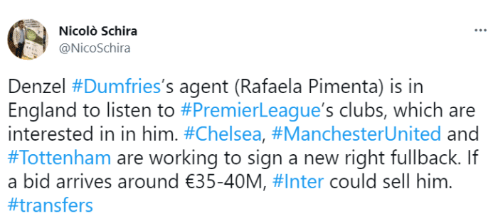 斯基拉表示,邓弗里斯的经纪人正在英国与一些英超俱乐部接触,切尔西、曼联和热刺都有意签下一名新的右后卫。