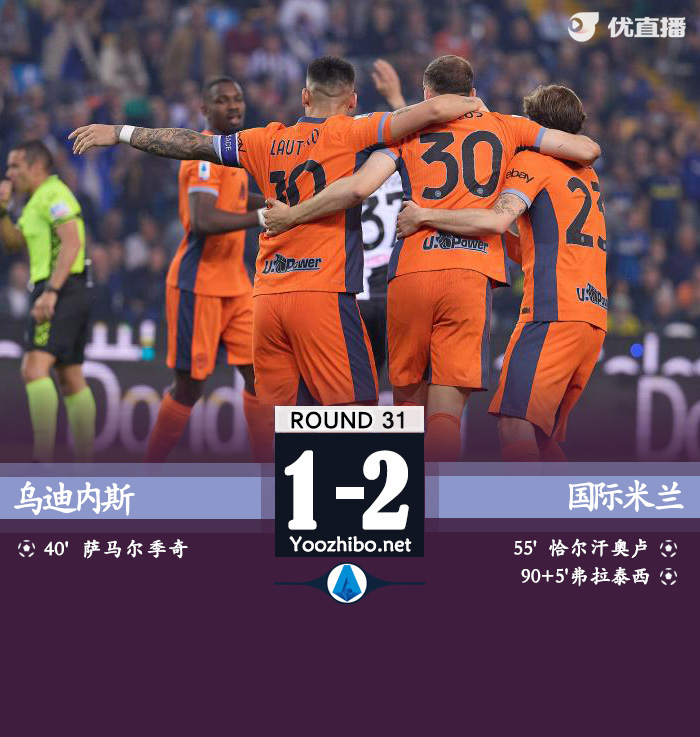 来源:24直播网04-09 09:32 24直播网讯:北京时间4月9日意甲联赛第31轮,乌迪内斯主场对阵国际米兰。上半场,萨马尔季奇似传似射,皮球慢悠悠滚入球网。下半场,图拉姆造点,恰尔汗奥卢主罚扳平比分。补时阶段,劳塔罗射门击中立柱弹出,弗拉泰西补射绝杀。全场比赛结束,国米2-1逆转击败乌迪内斯,14分优势领跑意甲。
