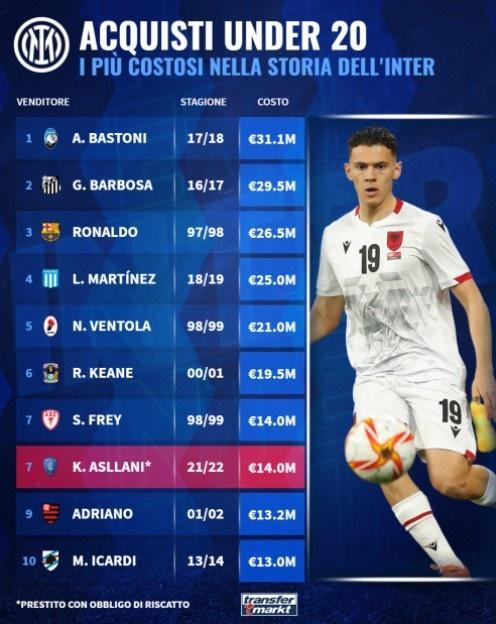 来源:24直播网07-01 12:3224直播网07月01日讯 今日,德转网站对国米队史引进的U20球员转会费进行了排序,巴斯托尼是3110万欧元最贵,大罗2650万欧元排名第三,阿斯拉尼排名第7名。