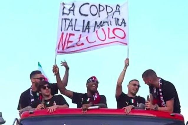 在庆祝活动中,迈尼昂和克鲁尼奇在大巴上举着写有“把意大利杯塞进你们X眼里去吧”字样的标语,特奥也发表了针对国米的侮辱口号,伊布更是直接让球迷发信息给恰尔汗奥卢,导致后者Instagram遭到爆破,还有雷比奇玩梗调侃小因扎吉的皮亚琴察口音。
