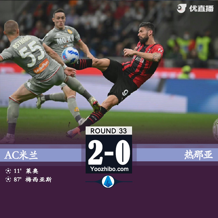 第86分钟,特奥左路长驱直入后直传,雷比奇禁区左侧传中,梅西亚斯凌空扫射被西里古扑出,随后自己补射得手,AC米兰2-0热那亚!