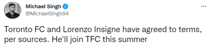 此外,据知名记者罗马诺报道,多伦多FC给因西涅开出了一份5年半的合同,保底年薪1100万欧元。