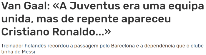 24直播网12月27日讯 据葡萄牙媒体《记录报》报道,荷兰主帅范加尔在接受AlgemeenDagblad采访时表示,C罗不符合尤文的俱乐部文化,而巴萨前几年过于依赖梅西。