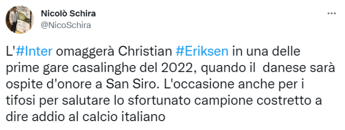 斯基拉表示,埃里克森将成为国米2022年首个主场比赛的重要嘉宾,他将在圣西罗球场接受俱乐部的致敬,球迷也有机会和这位丹麦中场告别。