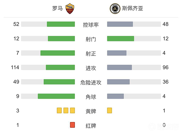 全场比赛结束,罗马2-0战胜斯佩齐亚。