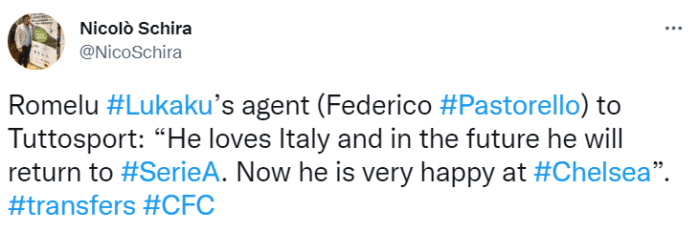 帕斯托雷洛告诉《都体》:“卢卡库很爱意大利,未来他会回到意甲,不过现在他在切尔西很开心。”