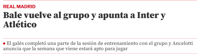 24直播网讯 据西班牙媒体《世界体育报》报道,贝尔可能在下周对阵国米或马竞时复出。